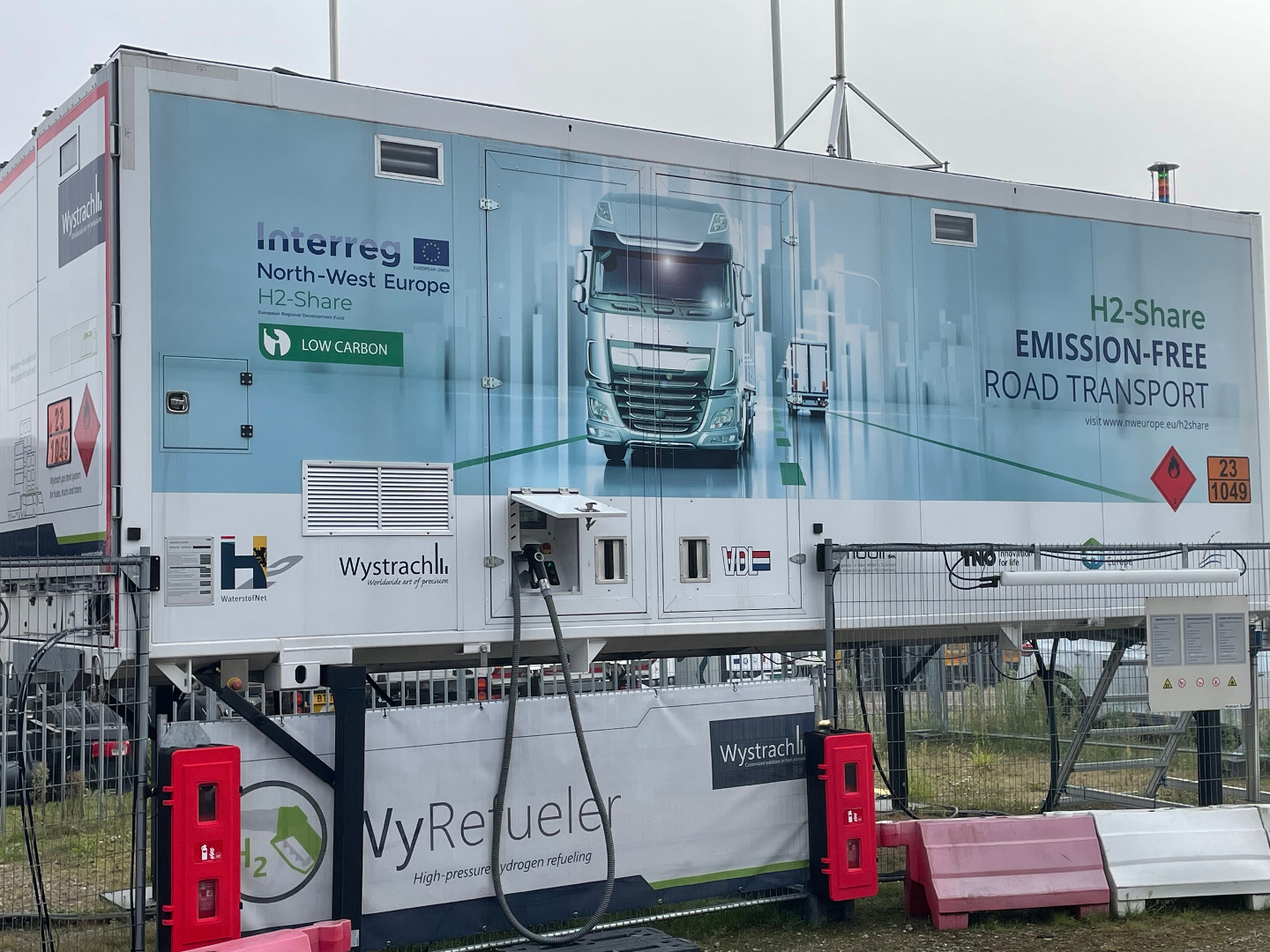 The municipal waste operator of Breda is operating 2 waste collection vehicles within the FCH-JU REVIVE project. These vehicles needed a refuelling station in anticipation of the multi-fuel HRS, built by TotalEnergies. To bridge the gap, they could refuel at our H2-Share mobile hydrogen refuelling station (the WyRefueller built by Wystrach). The City of Duisburg is also operating a hydrogen waste vehicle in the HECTOR project. They wanted to test their vehicle over long distance and Wystrach was able to showcase the mobile HRS. A demonstration and gathering was organised in Breda. The capability of the station was tested with a back-to-back refuelling of 2 waste collection vehicles ánd the H2-Share truck (piloting for DHL Express in Breda). The refuellings ran without any problems, showing the station’s easiness of use. So in essence, we shared knowledge and experience on truck technology, day-to-day operation and the hydrogen refuelling infrastructure. This overarching cooperation was made possible by Interreg and the FCH-JU. (See news article).
