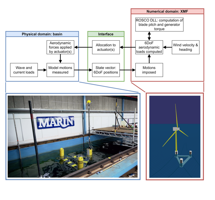 For physical model scale testing, a challenge is found in scaling all the loads. Hydrodynamic loads are scaled following Froude scaling laws. Here, the velocity decreases when scaling down a system for testing. Aerodynamic forces, on the other hand, follow Reynolds scaling. In Reynolds scaling, the velocity increases when scaling down. As a result, a Froude-scaled wind turbine model would experience a unrealistically low Reynolds number, and thus wrongly modelled aerodynamic forces. Different strategies exist to overcome this challenge. In a ‘full approach’, the wind turbine rotor geometry can be re-designed to correctly model the Froude-scaled forces, when subjected to a Froude-scaled wind speed and rotor speed, making all scaling consistent again. An alternative is found in a ‘simplified approach’, where the wind turbine is not modelled physically, but numerically. This form of testing is called software-in-the-loop (SiL), denoting the presence of a numerical wind turbine model in an otherwise physical test environment.