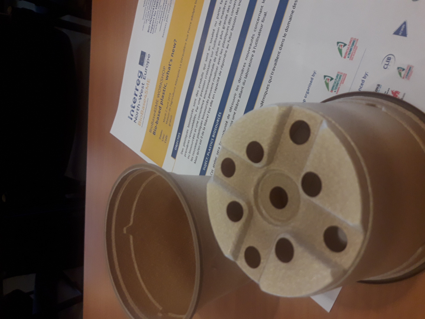 Next, Delphine Barbier from ISPA presented research competencies on the theme, focussing on IPSA’s range of projects. Two companies showed their technical competencies (formulation) and also talked about how they support businesses on specific projects. NaturePlast has found out how to create coffee cups from PLA which resist high temperatures and is also working on a type of PHA made from raw materials from sewage treatment plants (WOW Interreg project). Sandra Martin (Futuramat) presented a range of products such as PolyFibra®, BioFribra®, BioCérès® and BioMine® which are used for example to make flower pots, coffee capsules and tomato plant clips for McPlast. She insisted on the importance of material sourcing. It is very important to hav identical granulometric curves in order to maintain constant properties. Michel Criquetot from McPlast spoke to the participants about his experience in developing bio-based formulations. This SME started to develop its first bio-based formulations more than 10 years ago.