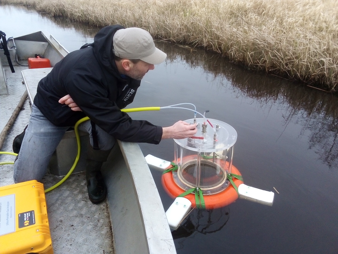 One of the innovations is the use of a floating chamber connected to a Los Gatos Research (LGR) analyzer (material lend by the colleagues from the Laboratoire de Physique et Chime de l’Environnement et de l’Espace, UO-CNRS-CNES). The floating chamber makes it possible to do the measurements of CO2 and CH4 fluxes directly in the channels and creeks of the Dutch pilot site 'De Wieden'. The first results are very encouraging since this early campaign allowed identifying the most relevant places for the future measurements.