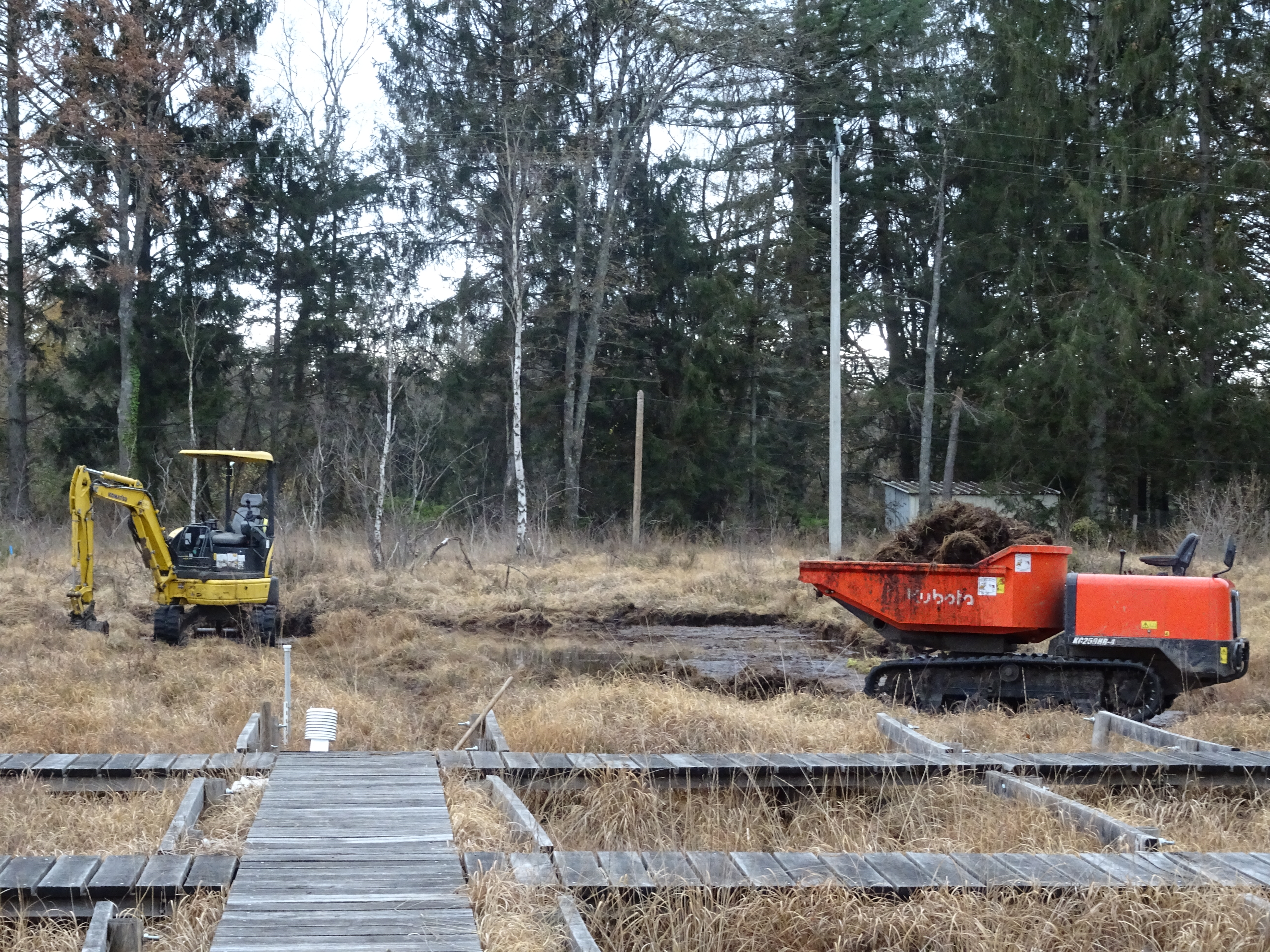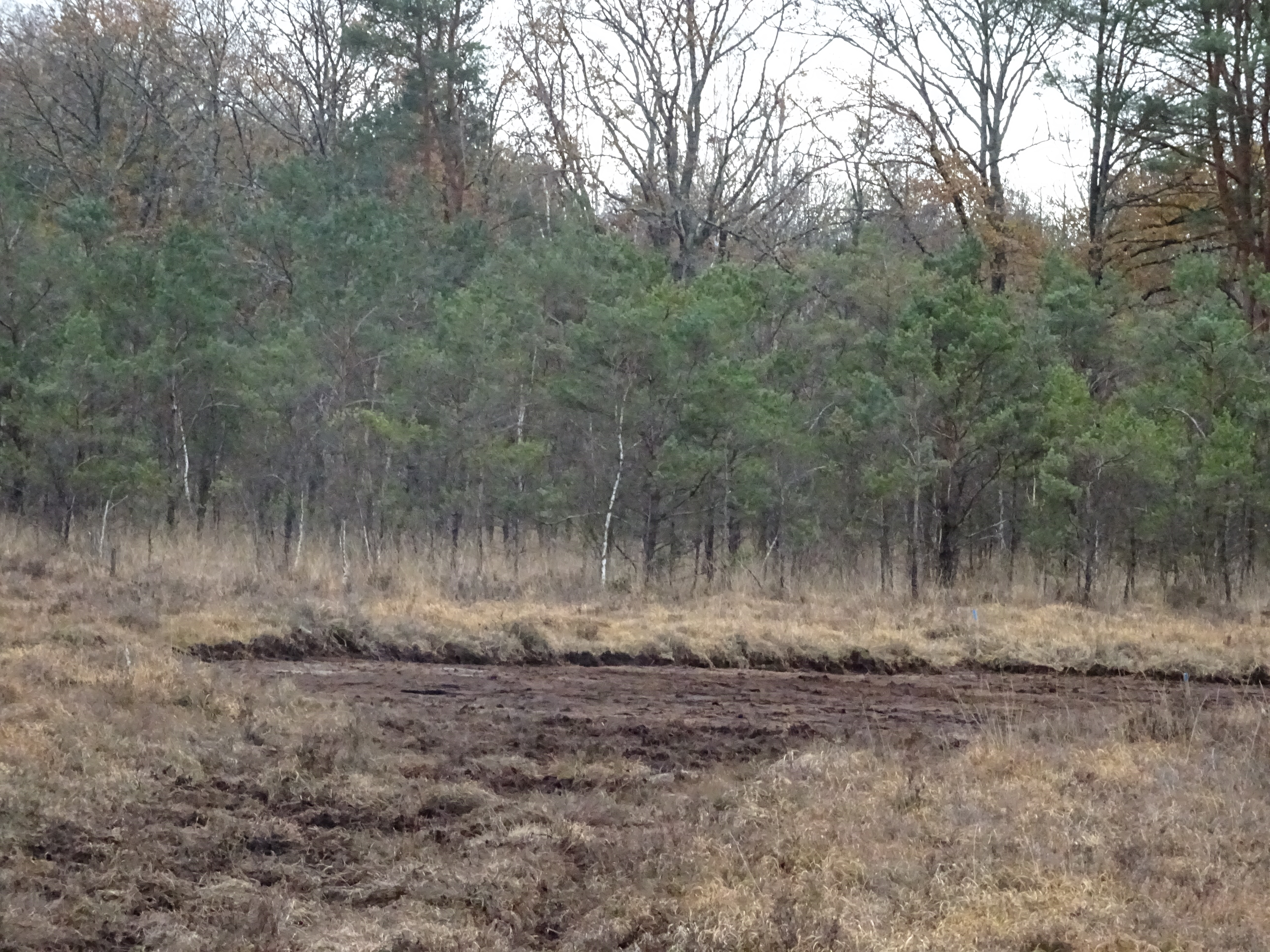 The restoration works at the French pilot site, La Guette, took place from the 24th of November to the 5th of December 2020. As planned, the vegetation and the first 10 cm of peat were stripped in two areas of about 600 m2.