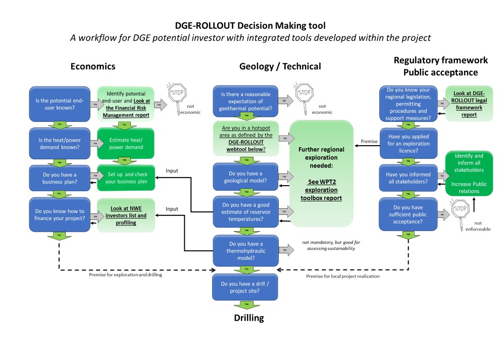 The decision-making tool reveals step by step which questions (in blue boxes) a potential DGE investor is recommended to answer before the drilling of a deep geothermal well, following three main axes: Economics, Geology/Technical, and Regulatory framework/Public acceptance. A positive answer leads to the next question. If the answer is “no”, actions are suggested (green boxes) or tools and helpful reports are provided, which have been developed within the DGE-ROLLOUT project (light green boxes).
