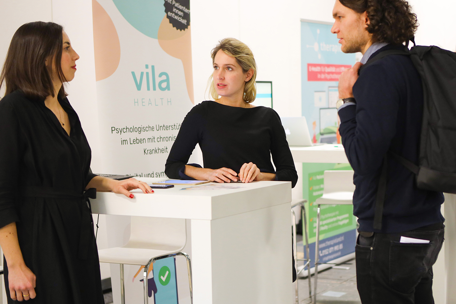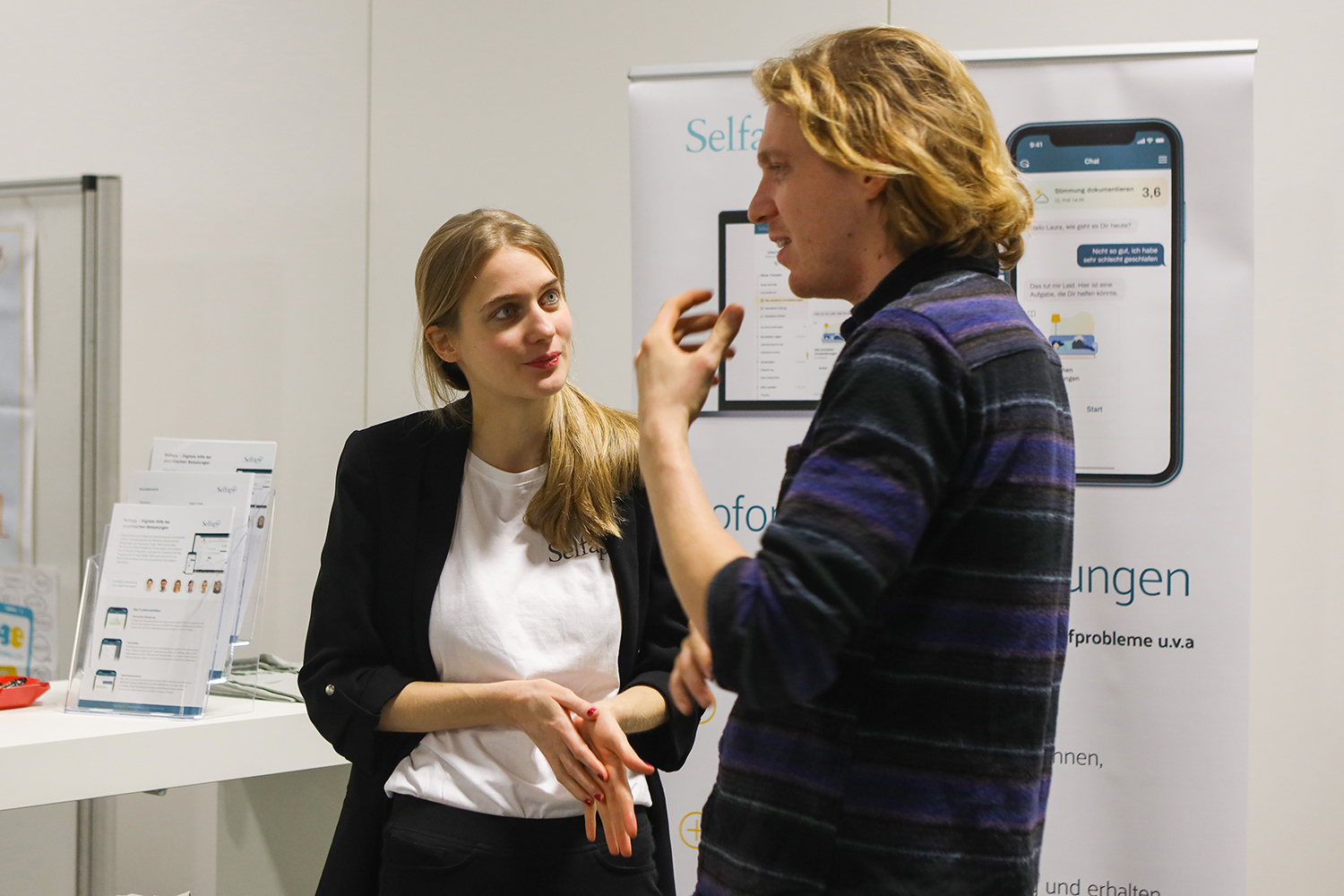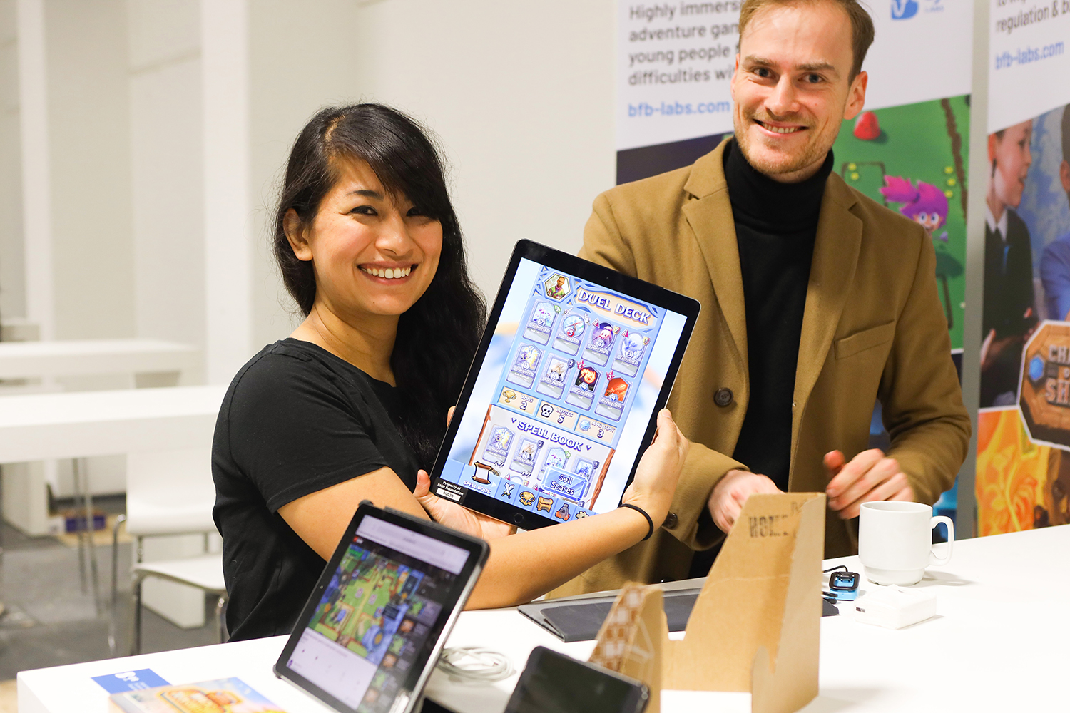 After the lunch break, which gave opportunity on a marketplace different smaller and middle enterprises from the range e-mental health to become acquainted, followed lectures to practicing application. Dr. Peter Tonn presented an outpatient care model with the help of digital support. Prof. Ulrich Voderholzer described an e-mental health concept for inpatient care. Prof. Jürgen L. Müller reported on five different, very promising e-mental health projects in forensics. At the end of the afternoon session, six start-ups presented their innovative ideas for improving psychosocial care in three-minute presentations (BfB Labs, Psydex, Myskills, eQuoo, Mindable, GET.ON). In addition, Interapy, KeepAppy, Pulso, Minddistrict, Mindpax, Moodbuster, Selfapy, Stopblues, Therapieland B.V. & Gezondeboel, vila health, Wellola Software and 7Mind were represented on the market square. During the breaks and at the get-together that followed, the participants had the opportunity to gain initial experience in using the software, to try out the products directly on site and to talk to the providers and developers.