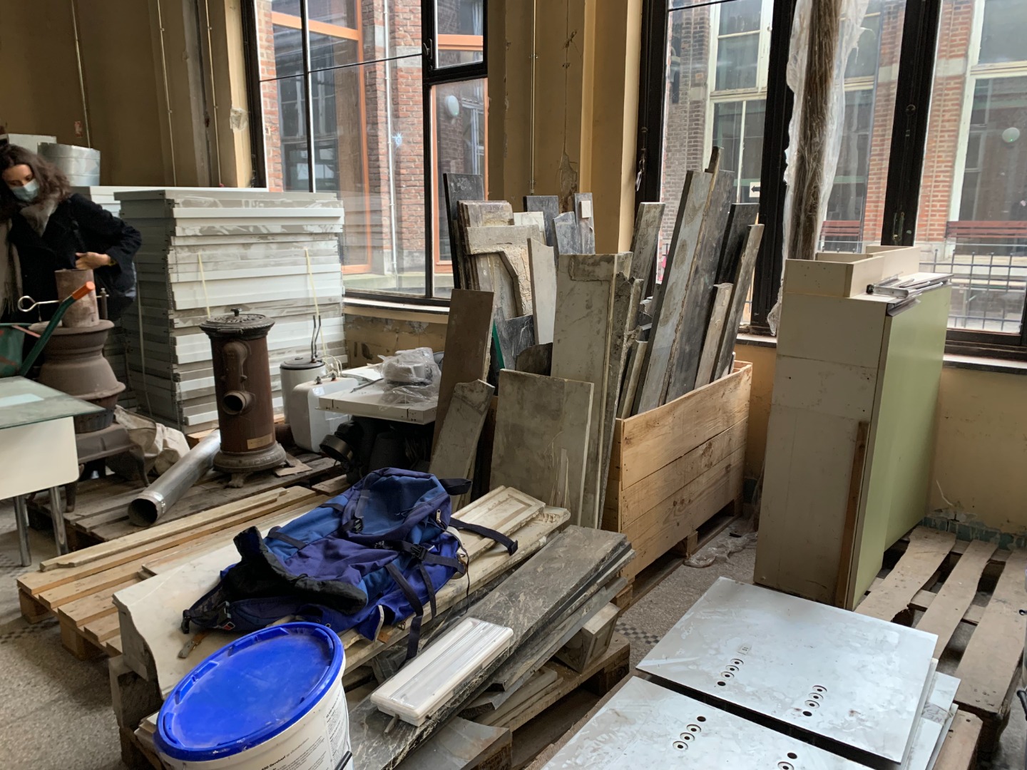 We had the opportunity to go through the "storage room", a key part of the organization of reuse, as you know that to reintegrate materials, in situ or ex situ, in a project, you have to know how to store them somewhere. The need to reserve a space in the building for this purpose was obvious throughout the project. This room will be kept for the Zinneke teams later on as a "resourcerie" center. In addition, the garden of a neighboring house was used for the storage of larger pieces of the ongoing renovation.