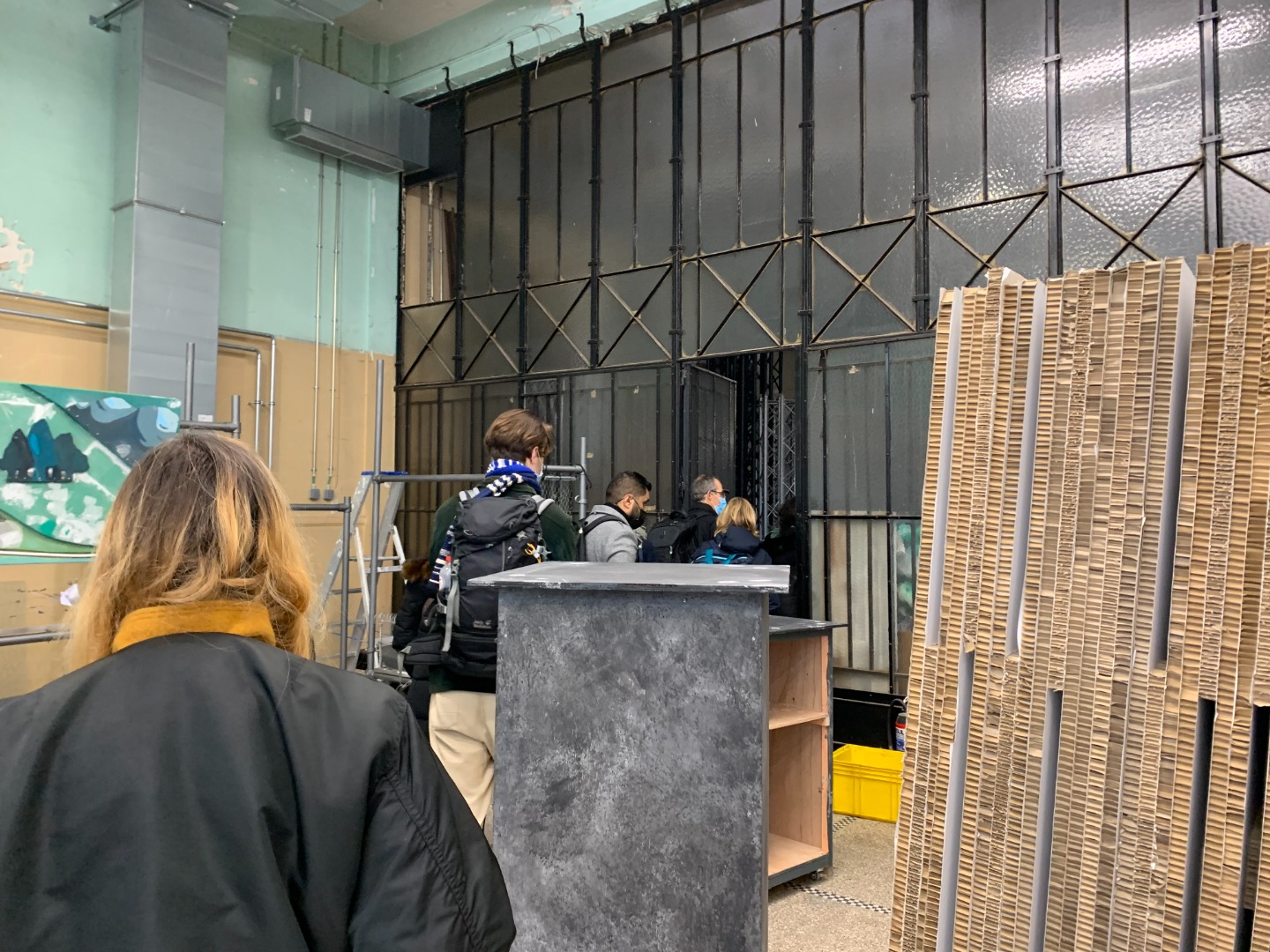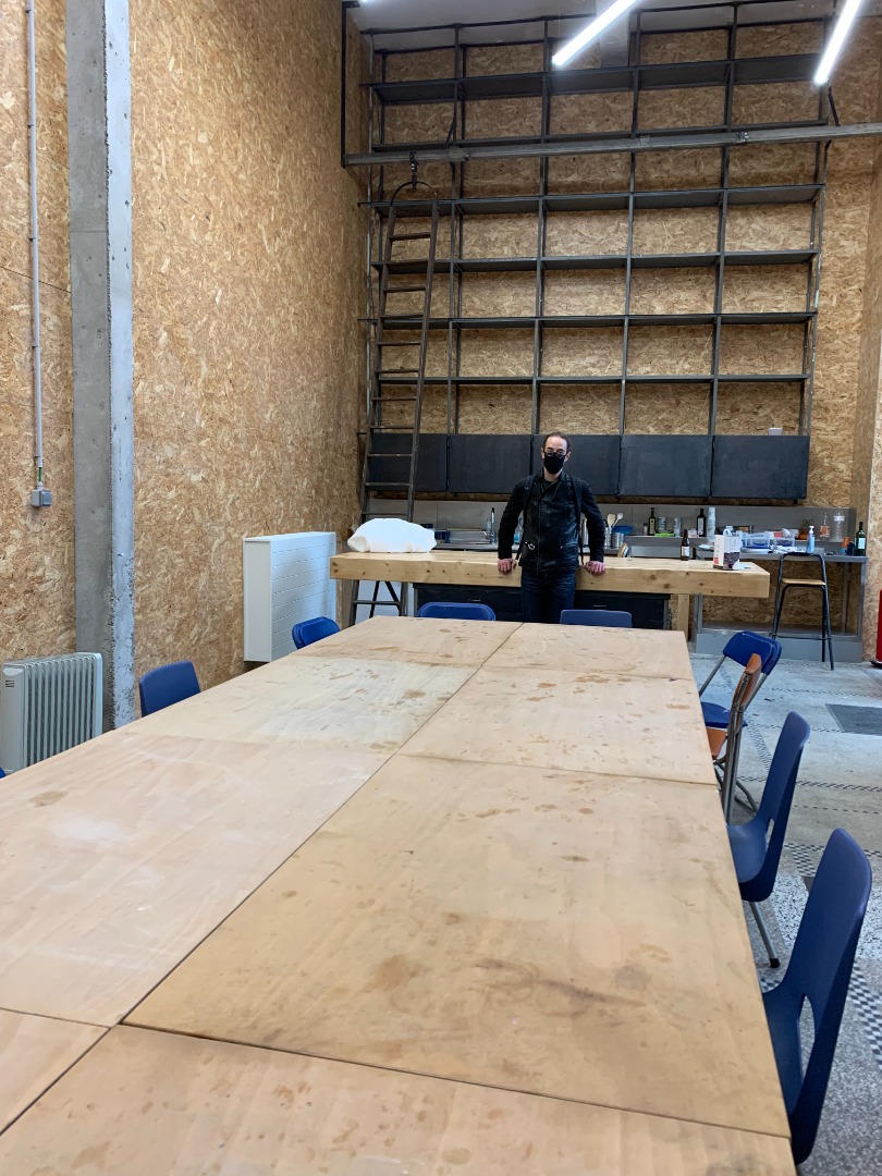 - Insulation, wooden shelves, a fire door and glass windows: the cafeteria is full of reused materials. The shelves in the back of the cafeteria have been given a second life, as has the old ladder that provides access to them. Behind the numerous OSB panels, we find a batch of insulation panels from another building that was salvaged at a ridiculously low price. The glass part is entering its third life cycle. Previously used as exterior glass, it remains in the project but is used in the interior. The fire door comes from an office building in Paris. Difficult to reuse as a fire door because it would have to comply with strict regulations to be up to standards, it is used as a simple door in this project, so without obligations in terms of function.