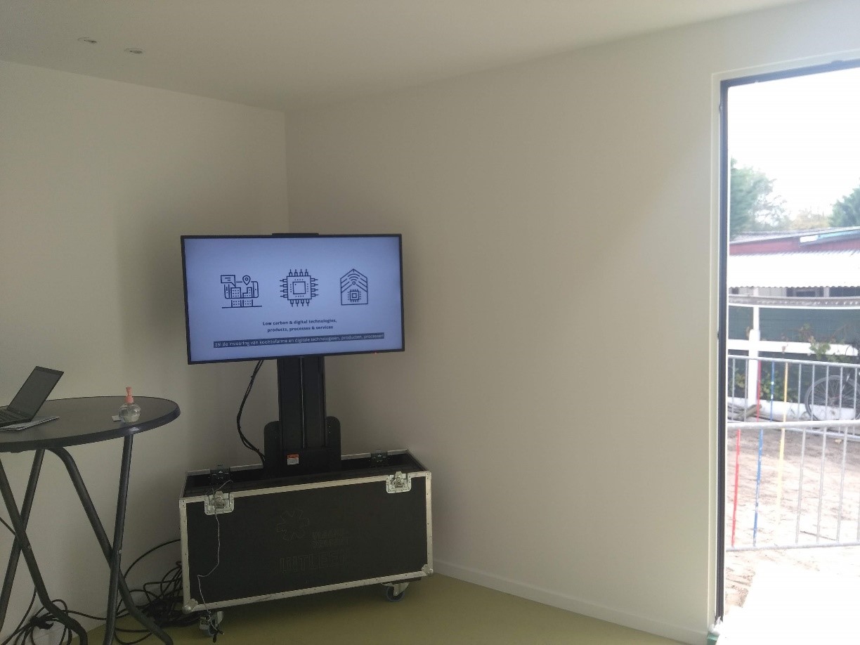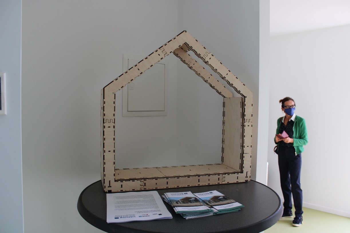 Both the one-minute video of the Flemish H4.0E pilot and the project animation were broadcast on a video screen, and sketches of the pilot houses were presented in addition to the model of the WikiHouse. The H4.0E project brochure (in Dutch) and the pilot leaflet with more information about the pilot were distributed to the stakeholders.