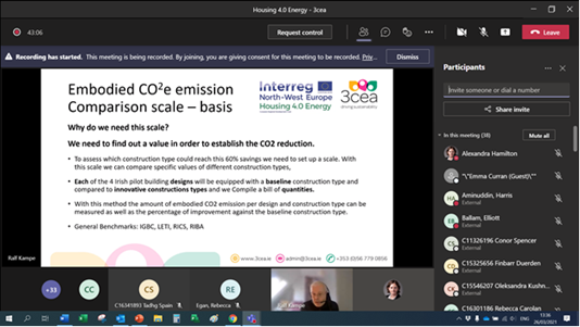 Alexandra Hamilton and Ralf Kampe of 3 Counties Energy Agency (3CEA) in Ireland presented the Housing 4.0 Energy project via webinar, held on the 26th of March 2021 via Zoom. The presentation covered the project's aims and how 3CEA hopes to achieve them, in addition to discussions on the technical details of the project, such as materials and method intended for use.