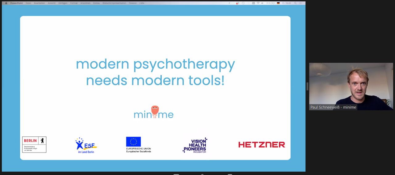 - 1st winner: minime: brings together therapy and everyday life for patients. Indeed, the usual homework after therapy sessions which is now in a paper format will be included in the minime application in a virtual format. And for therapists, it will be easier to follow up the progression of the patients.