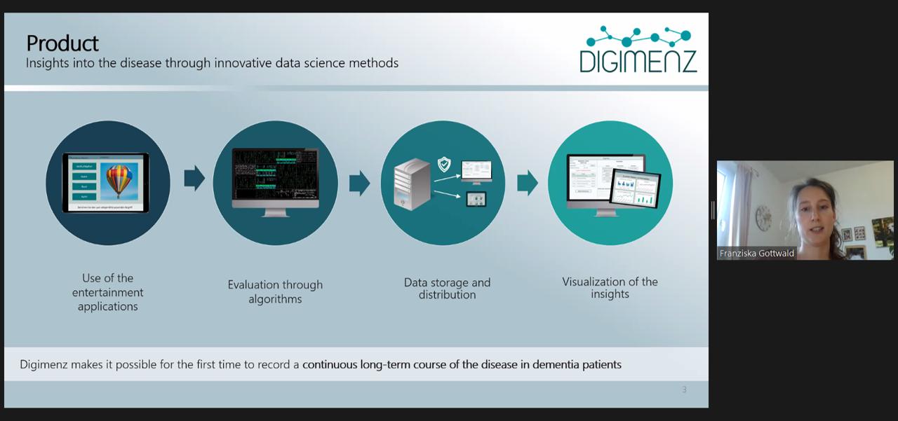 - 2nd winner: Digimenz: is an application with customisable games for patients suffering from dementia. It allows them to train their brain for a better quality of life and it also provides relatives and doctors with valuable insights on the course of their disease.