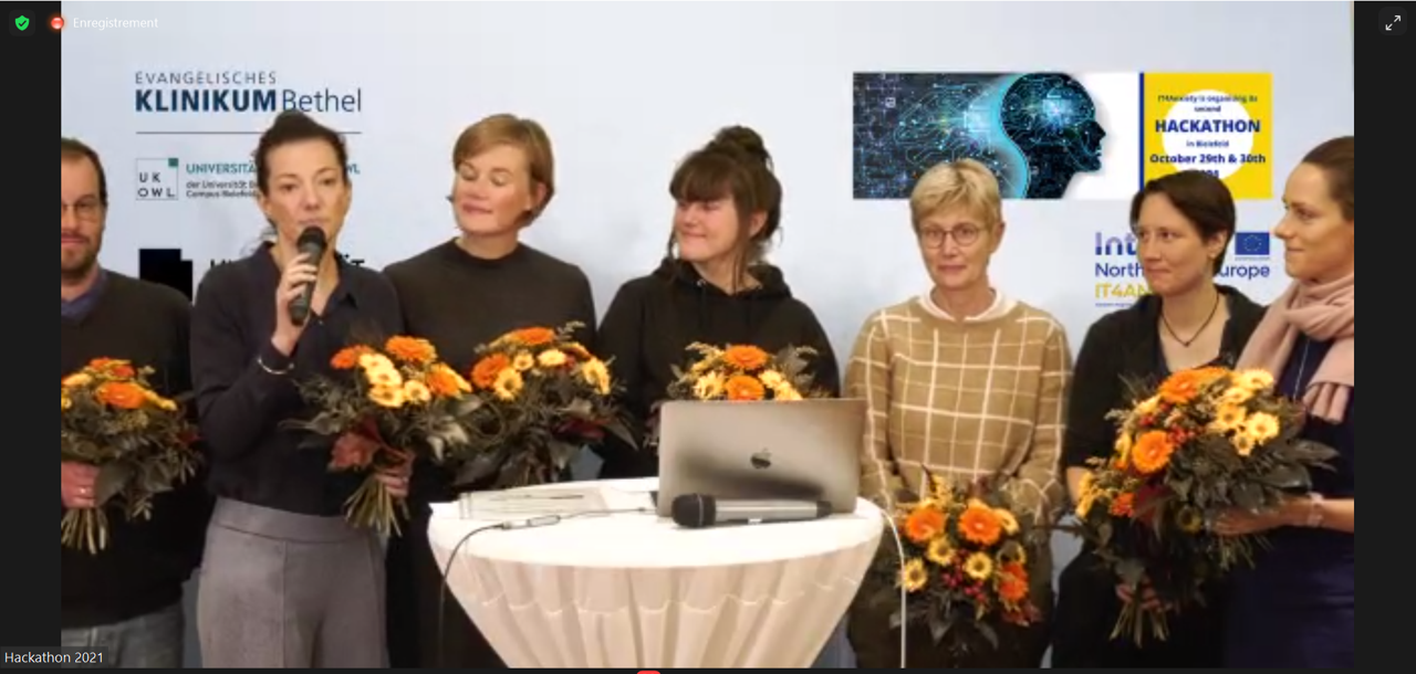 At the end of this event, the jury deliberated to select the first and second winner of this second Hackathon. The first winner was awarded 1500€ and an initial pilot study to be conducted at the EvKB Bielefeld to validate and further investigate their solution whereas the second winner had to chance to get 1500€ to develop their project. The winners of this second IT4Anxiety Hackathon were: