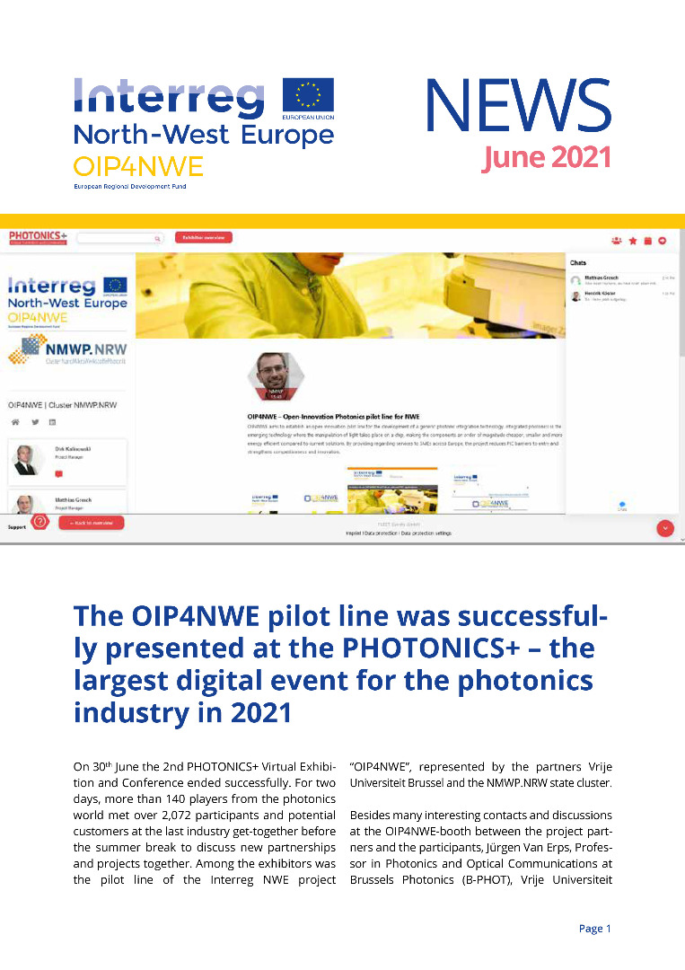 On 30th June the 2nd PHOTONICS+ Virtual Exhibition and Conference ended successfully. For two days, more than 140 players from the photonics world met over 2,072 participants and potential customers at the last industry get-together before the summer break to discuss new partnerships and projects together. Among the exhibitors was the pilot line of the Interreg NWE project “OIP4NWE”, represented by the partners Vrije Universiteit Brussel and the NMWP.NRW state cluster.