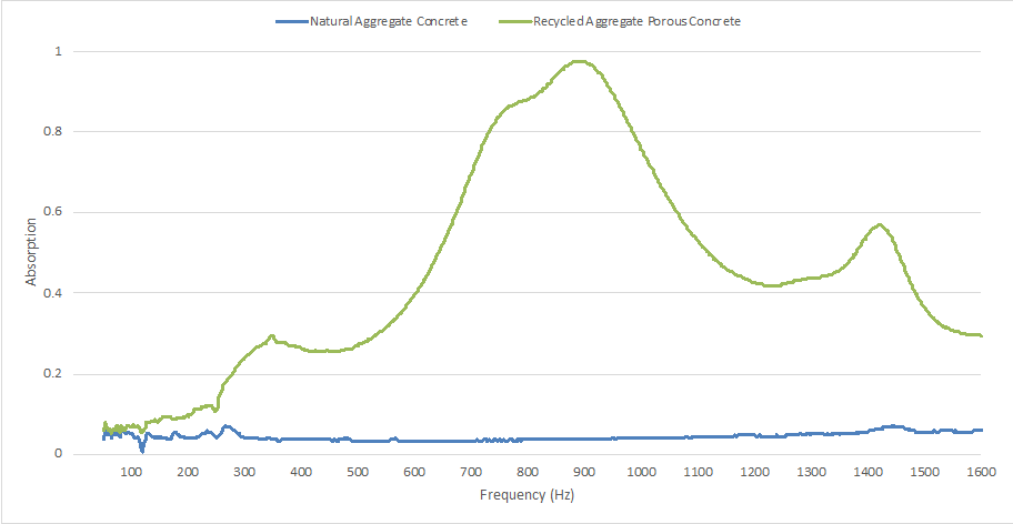 Graphical representation of the measured acoustic absorption of concrete with natural aggregate (blue line) and porous concrete with recycled aggregate (green line).