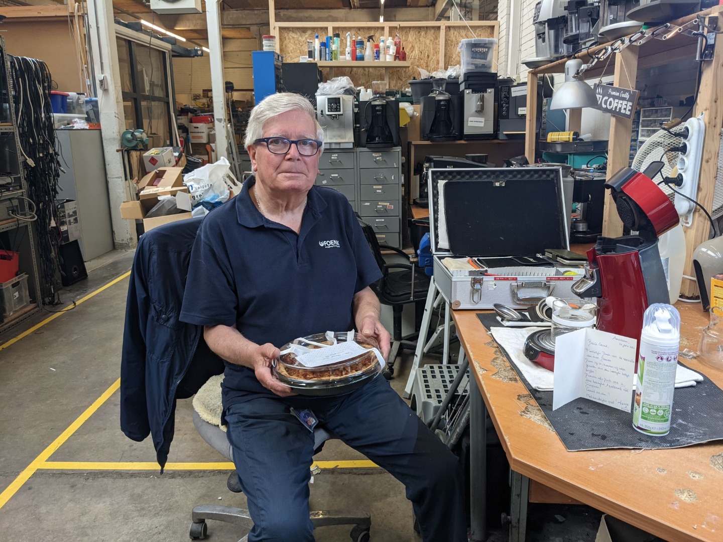 Here is a nice story directly from the repair cafe: Our colleague, Gerrit, aged 81, an expert in the field of Senseo devices, received an apple pie, whipped cream, and a beautiful card from two customers this morning. They were so happy that their Senseo machine was up and running and that they could enjoy their delicious coffee again. The Senseo device came in through Repair Connects.
